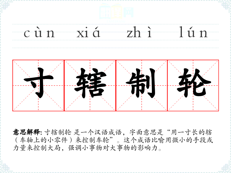 寸辖制轮 这个成语不仅体现了汉语的精妙,也反映了中华文化中对细节和策略的重视。在学*语言和表达中,理解和运用这样的成语能够丰富我们的表达方式,提升沟通的深度和广度。