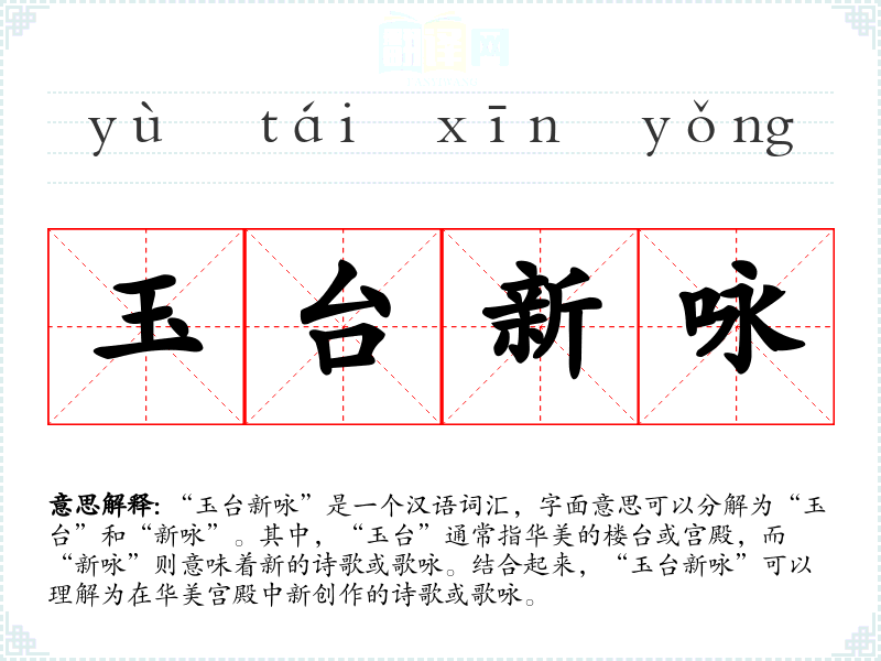 “玉台新咏”是一个汉语词汇,字面意思可以分解为“玉台”和“新咏”。其中,“玉台”通常指华美的楼台或宫殿,而“新咏”则意味着新的诗歌或歌咏。结合起来,“玉台新咏”可以理解为在华美宫殿中新创作的诗歌或歌咏。