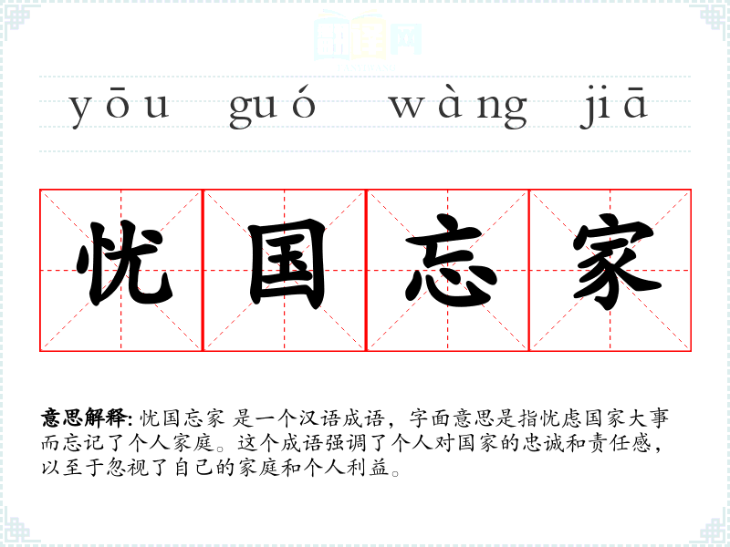 忧国忘家 是一个汉语成语,字面意思是指忧虑国家大事而忘记了个人家庭。这个成语强调了个人对国家的忠诚和责任感,以至于忽视了自己的家庭和个人利益。