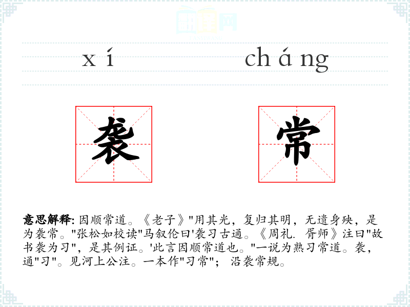 1.因顺常道。《老子》"用其光,复归其明,无遗身殃,是为袭常。"张松如校读"马叙伦曰'袭习古通。《周礼.胥师》注曰"故书袭为习",是其例证。'此言因顺常道也。"一说为熟习常道。袭,通"习"。见河上公注。一本作"习常"; 沿袭常规。