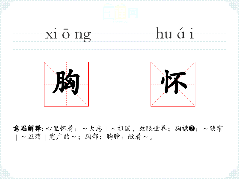 ;胸襟➋:~狭窄|~坦荡|宽广的~;胸部;胸膛:敞着~。