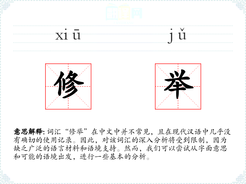 由于“修举”在现代汉语中不常见,其在其他语言或文化中的对应词汇也难以确定。