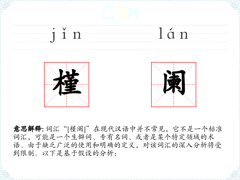 由于“槿阑”不是一个标准词汇,我们无法提供确切的基本定义。它可能是由两个字组成的复合词,其中“槿”可能指代木槿花,而“阑”可能与栏杆、界限有关。