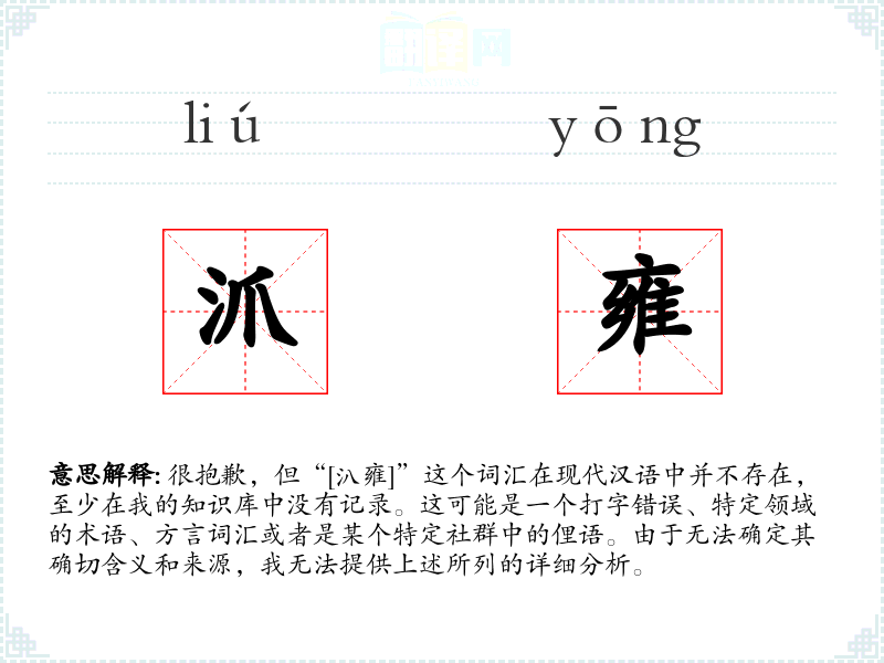 很抱歉,但“[汃雍]”这个词汇在现代汉语中并不存在,至少在我的知识库中没有记录。这可能是一个打字错误、特定领域的术语、方言词汇或者是某个特定社群中的俚语。由于无法确定其确切含义和来源,我无法提供上述所列的详细分析。