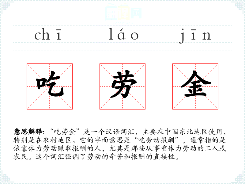 “吃劳金”是一个汉语词汇,主要在**东北地区使用,特别是在农村地区。它的字面意思是“吃劳动报酬”,通常指的是依靠体力劳动赚取报酬的人,尤其是那些从事重体力劳动的工人或农民。这个词汇强调了劳动的辛苦和报酬的直接性。