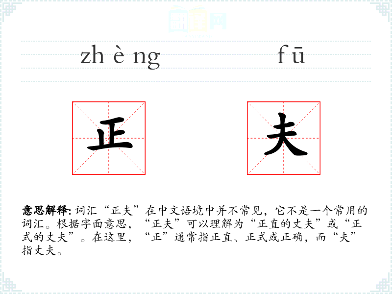 词汇“正夫”在中文语境中并不常见,它不是一个常用的词汇。根据字面意思,“正夫”可以理解为“正直的丈夫”或“正式的丈夫”。在这里,“正”通常指正直、正式或正确,而“夫”指丈夫。
