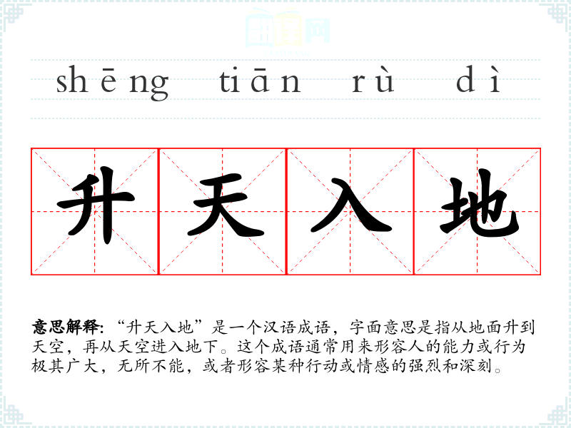 “升天入地”是一个汉语成语,字面意思是指从地面升到天空,再从天空进入地下。这个成语通常用来形容人的能力或行为极其广大,无所不能,或者形容某种行动或情感的强烈和深刻。