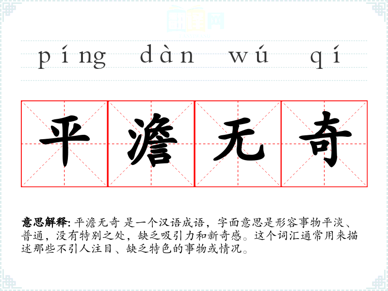 平澹无奇 是一个汉语成语,字面意思是形容事物平淡、普通,没有特别之处,缺乏吸引力和新奇感。这个词汇通常用来描述那些不引人注目、缺乏特色的事物或情况。