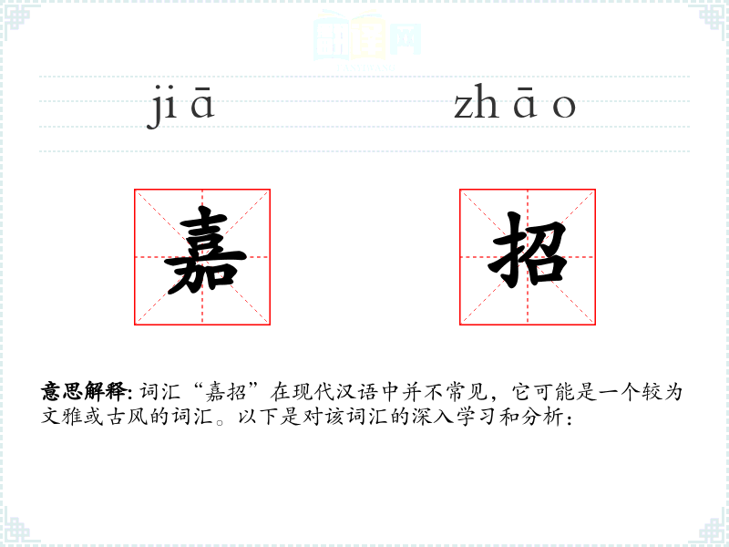 词汇“嘉招”在现代汉语中并不常见,它可能是一个较为文雅或古风的词汇。以下是对该词汇的深入学*和分析: