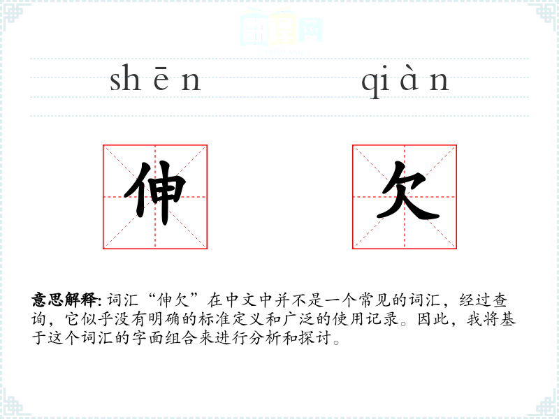 “伸欠”字面意思可能是指“伸展和欠身”的动作。其中,“伸”通常指伸展身体或肢体,而“欠”在某些语境下可以指身体向前倾斜的动作,类似于鞠躬或欠身的姿势。