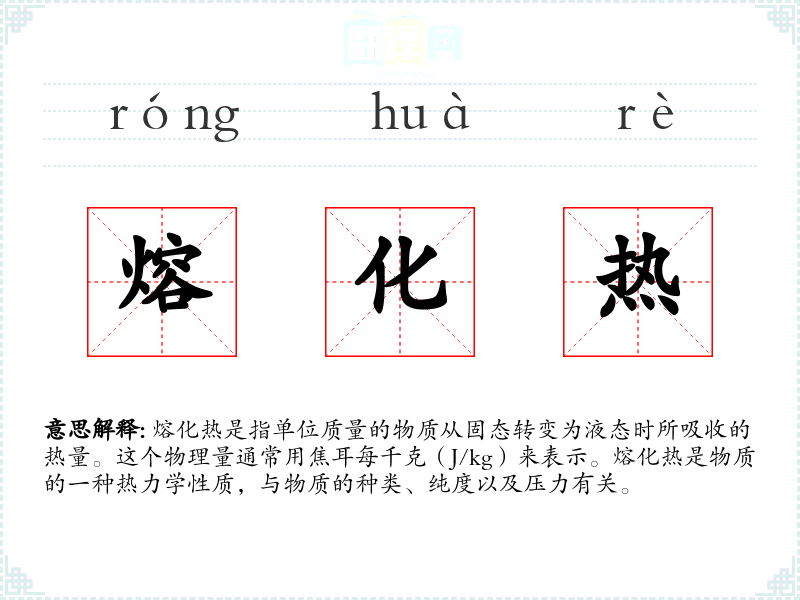 同义词:熔解热、熔化潜热 反义词:凝固热(指物质从液态转变为固态时释放的热量)