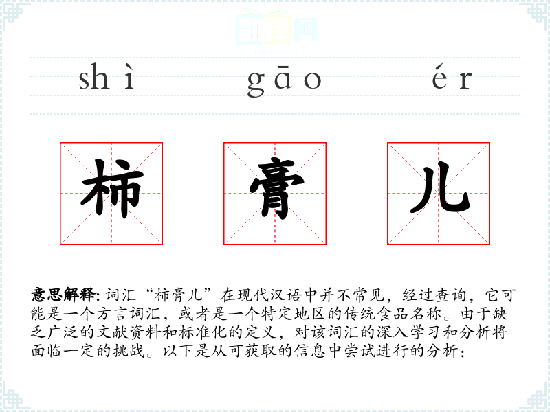 词汇“柿膏儿”在现代汉语中并不常见,经过查询,它可能是一个方言词汇,或者是一个特定地区的传统食品名称。由于缺乏广泛的文献资料和标准化的定义,对该词汇的深入学习和分析将面临一定的挑战。以下是从可获取的信息中尝试进行的分析: