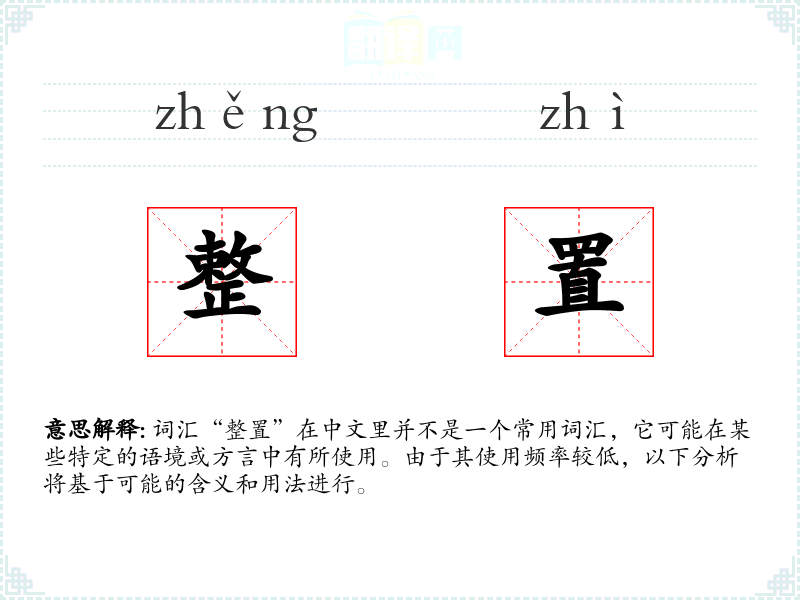 词汇“整置”在中文里并不是一个常用词汇,它可能在某些特定的语境或方言中有所使用。由于其使用频率较低,以下分析将基于可能的含义和用法进行。
