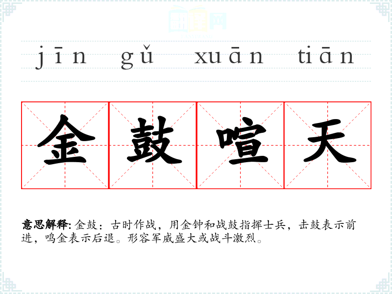 金鼓:古时作战,用金钟和战鼓指挥士兵,击鼓表示前进,鸣金表示后退。形容军威盛大或战斗激烈。