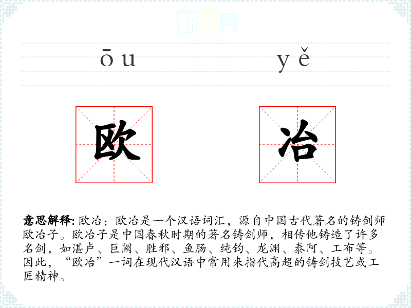 “欧冶”一词源自**古代的铸剑师欧冶子,其名字本身就代表了高超的技艺和工匠精神。随着时间的推移,这个词逐渐被用来泛指任何领域的精湛技艺或工匠精神。