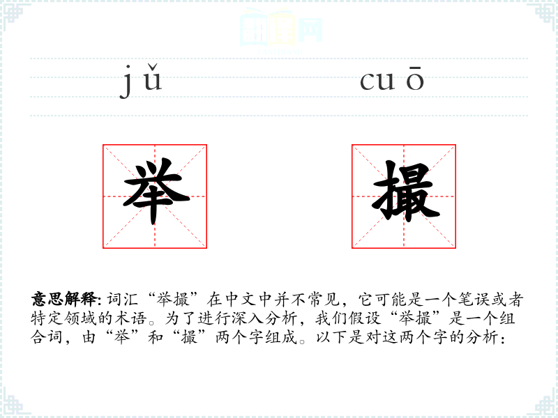 词汇“举撮”在中文中并不常见,它可能是一个笔误或者特定领域的术语。为了进行深入分析,我们假设“举撮”是一个组合词,由“举”和“撮”两个字组成。以下是对这两个字的分析: