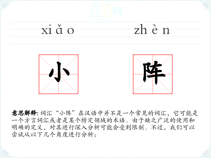 词汇“小阵”在汉语中并不是一个常见的词汇,它可能是一个方言词汇或者是某个特定领域的术语。由于缺乏广泛的使用和明确的定义,对其进行深入分析可能会受到限制。不过,我们可以尝试从以下几个角度进行分析: