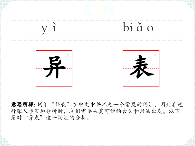 词汇“异表”在中文中并不是一个常见的词汇,因此在进行深入学习和分析时,我们需要从其可能的含义和用法出发。以下是对“异表”这一词汇的分析: