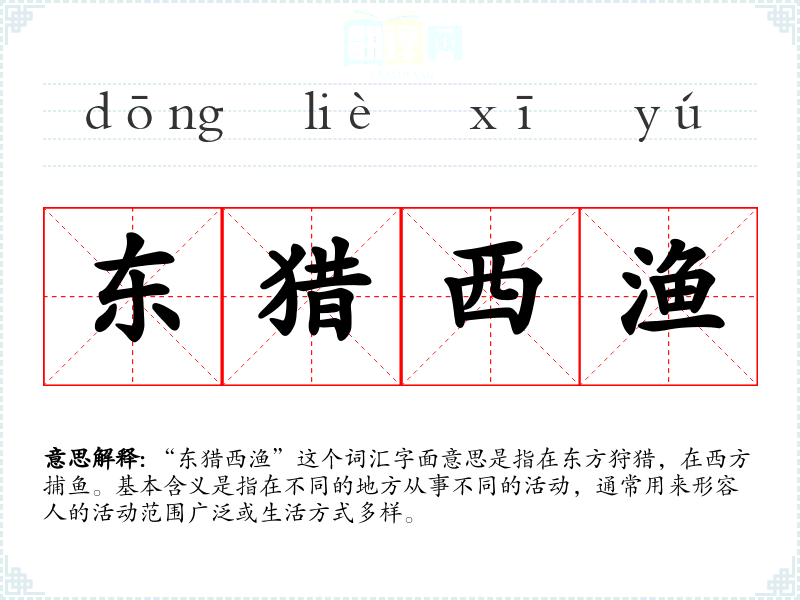 “东猎西渔”这个词汇字面意思是指在东方狩猎,在西方捕鱼。基本含义是指在不同的地方从事不同的活动,通常用来形容人的活动范围广泛或生活方式多样。