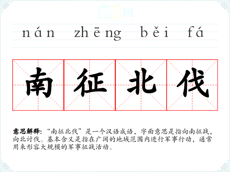 “南征北伐”是一个汉语成语,字面意思是指向南征战,向北讨伐。基本含义是指在广阔的地域范围内进行军事行动,通常用来形容***的军事征战活动。
