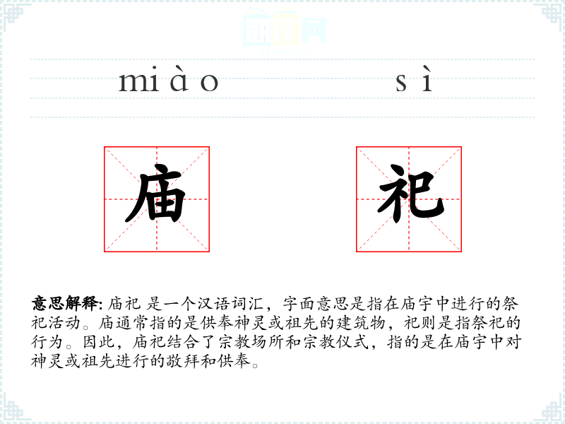 同义词如“祭拜”和“祭祀”在意义上与庙祀相近,但“祭拜”更侧重于对神灵或祖先的尊敬行为,而“祭祀”则更广泛地指代各种仪式。反义词如“亵渎”和“忽视”则分别表示对仪式的不敬和对**活动的漠视。