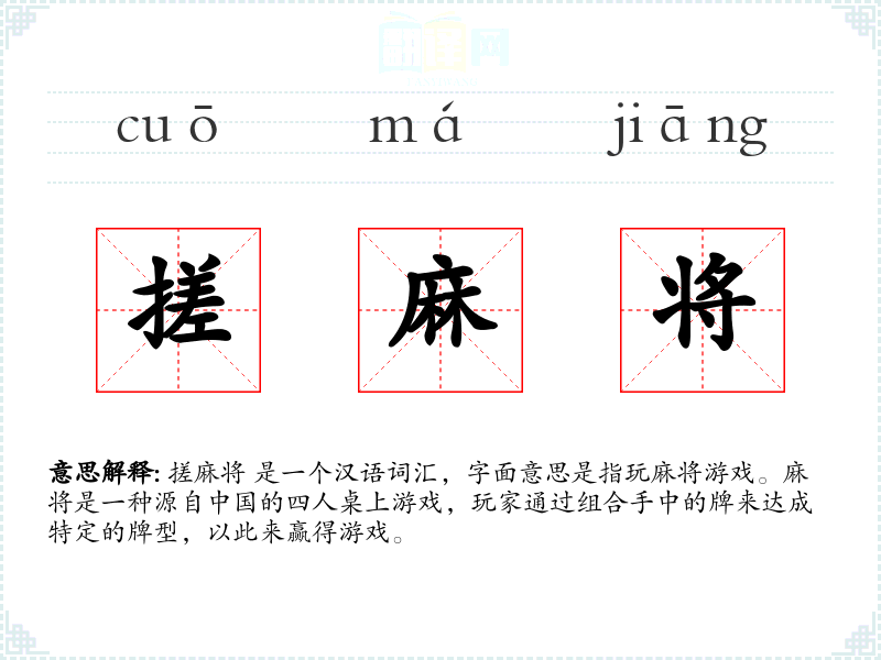 "搓麻将"的意思解释、搓麻将是什么意思由翻译网汉语词典查词提供。