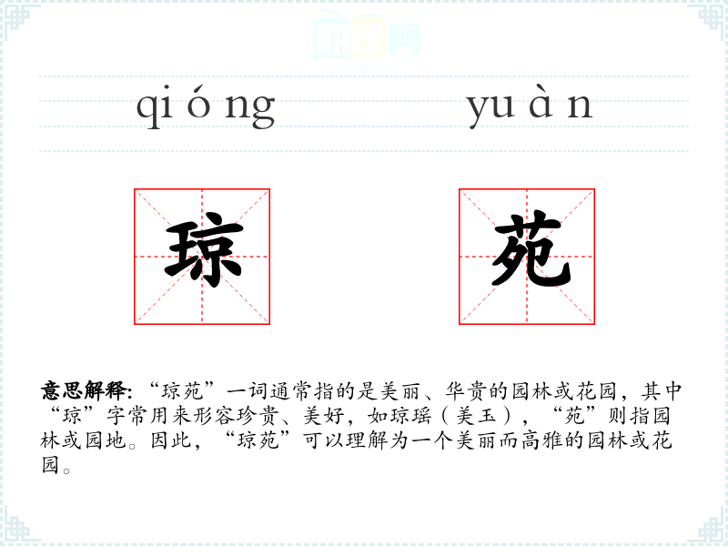 “琼苑”一词通常指的是美丽、华贵的园林或花园,其中“琼”字常用来形容珍贵、美好,如琼瑶(美玉),“苑”则指园林或园地。因此,“琼苑”可以理解为一个美丽而高雅的园林或花园。