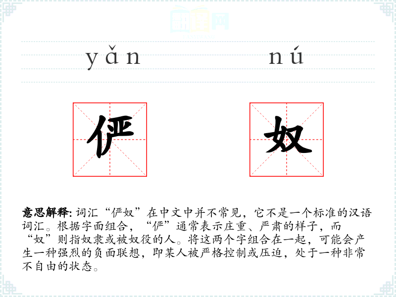 - 字面意思和基本含义:结合“俨”的庄重和“奴”的被奴役,可以理解为“俨奴”描述的是一种严肃、庄重但又极度受限和被压迫的状态或角色。