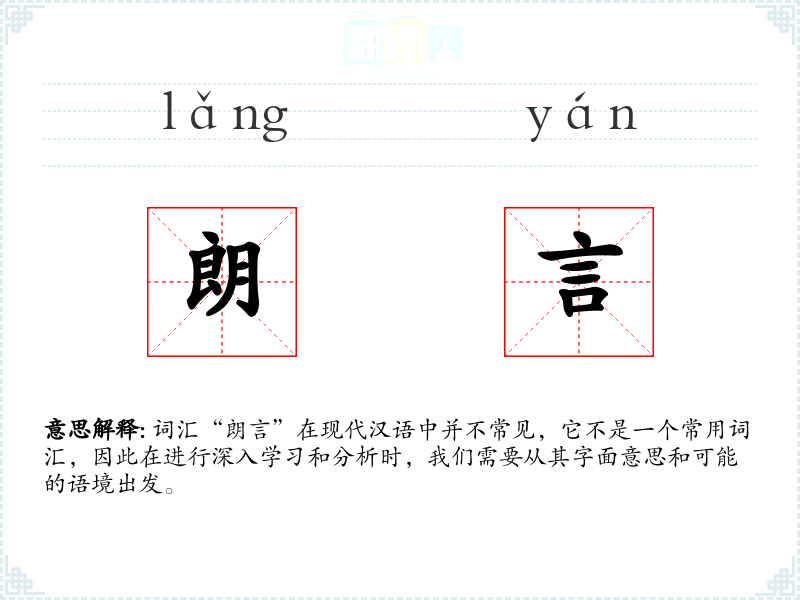词汇“朗言”在现代汉语中并不常见,它不是一个常用词汇,因此在进行深入学习和分析时,我们需要从其字面意思和可能的语境出发。