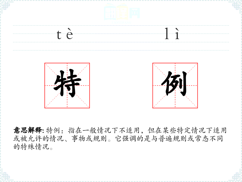特例:指在一般情况下不适用,但在某些特定情况下适用或被允许的情况、事物或规则。它强调的是与普遍规则或常态不同的特殊情况。