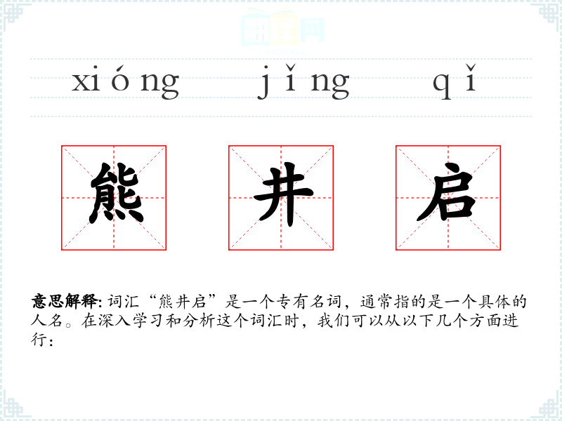 词汇“熊井启”是一个专有名词,通常指的是一个具体的人名。在深入学*和分析这个词汇时,我们可以从以下几个方面进行: