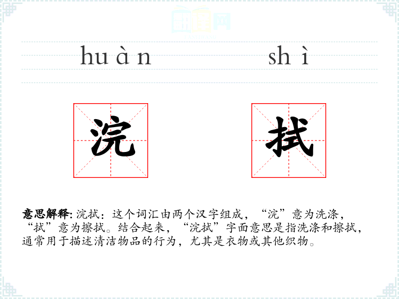 浣拭:这个词汇由两个汉字组成,“浣”意为洗涤,“拭”意为擦拭。结合起来,“浣拭”字面意思是指洗涤和擦拭,通常用于描述清洁物品的行为,尤其是衣物或其他织物。