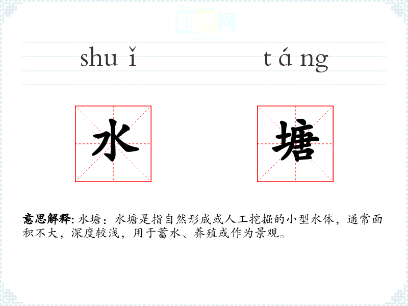 - 词源:水塘一词由“水”和“塘”组成,“水”指液体,“塘”指小型水体。