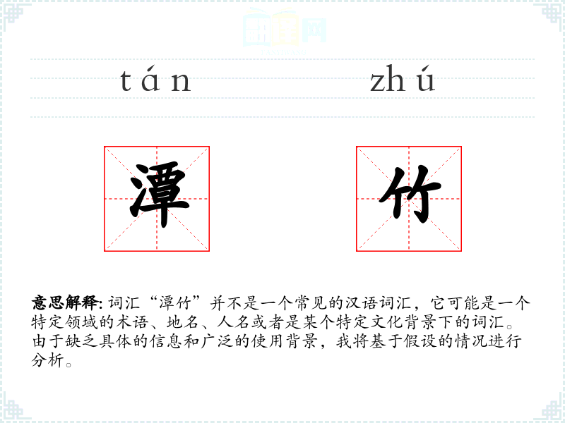 如果“潭竹”是一个地名或人名,那么它的字面意思可能并不具有普遍的解释意义,而是特定于某个地方或个人的名称。如果它是一个合成词,那么“潭”通常指深水池或湖泊,“竹”则指竹子,结合起来可能指的是一个有竹子的深水池或湖泊。