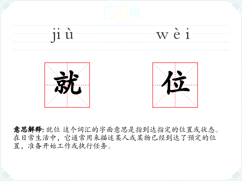 就位 这个词汇的字面意思是指到达指定的位置或状态。在日常生活中,它通常用来描述某人或某物已经到达了预定的位置,准备开始工作或执行任务。