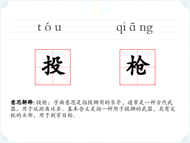 投枪:字面意思是指投掷用的长矛,通常是一种古代武器,用于远距离攻击。基本含义是指一种用于投掷的武器,具有尖锐的头部,用于刺穿目标。