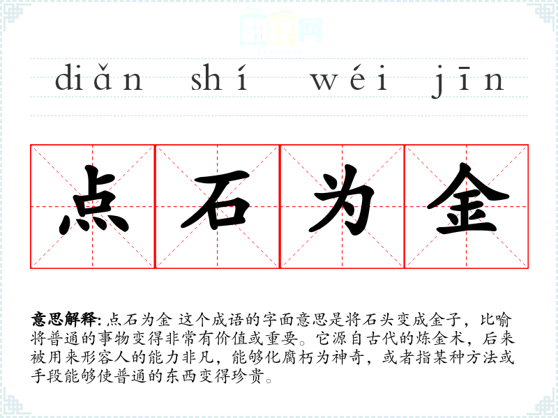 点石为金 这个成语的字面意思是将石头变成金子,比喻将普通的事物变得非常有价值或重要。它源自古代的炼金术,后来被用来形容人的能力非凡,能够化腐朽为神奇,或者指某种方法或手段能够使普通的东西变得珍贵。