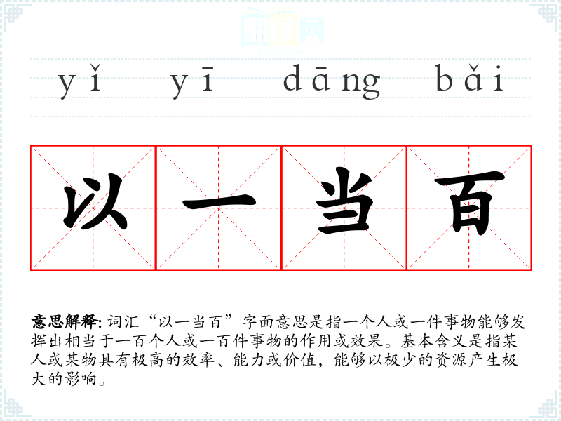 词汇“以一当百”字面意思是指一个人或一件事物能够发挥出相当于一百个人或一百件事物的作用或效果。基本含义是指某人或某物具有极高的效率、能力或价值,能够以极少的资源产生极大的影响。