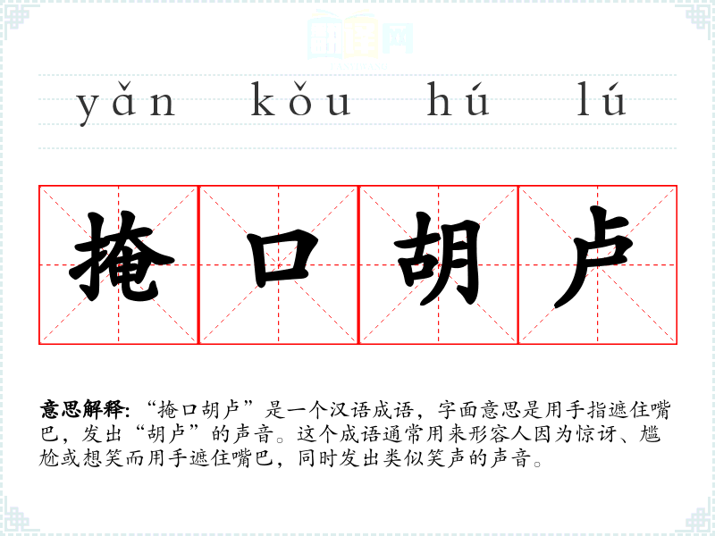 “掩口胡卢”是一个汉语成语,字面意思是用手指遮住嘴巴,发出“胡卢”的声音。这个成语通常用来形容人因为惊讶、尴尬或想笑而用手遮住嘴巴,同时发出类似笑声的声音。