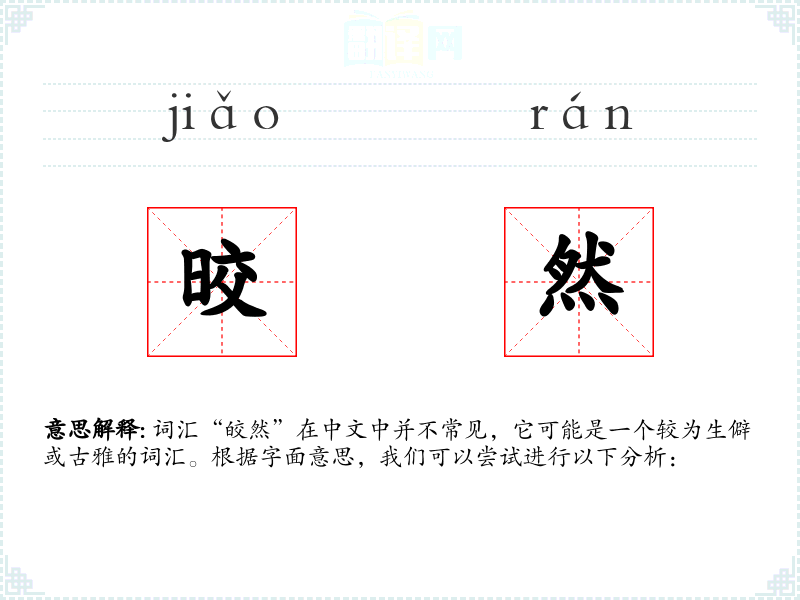 词汇“皎然”在中文中并不常见,它可能是一个较为生僻或古雅的词汇。根据字面意思,我们可以尝试进行以下分析: