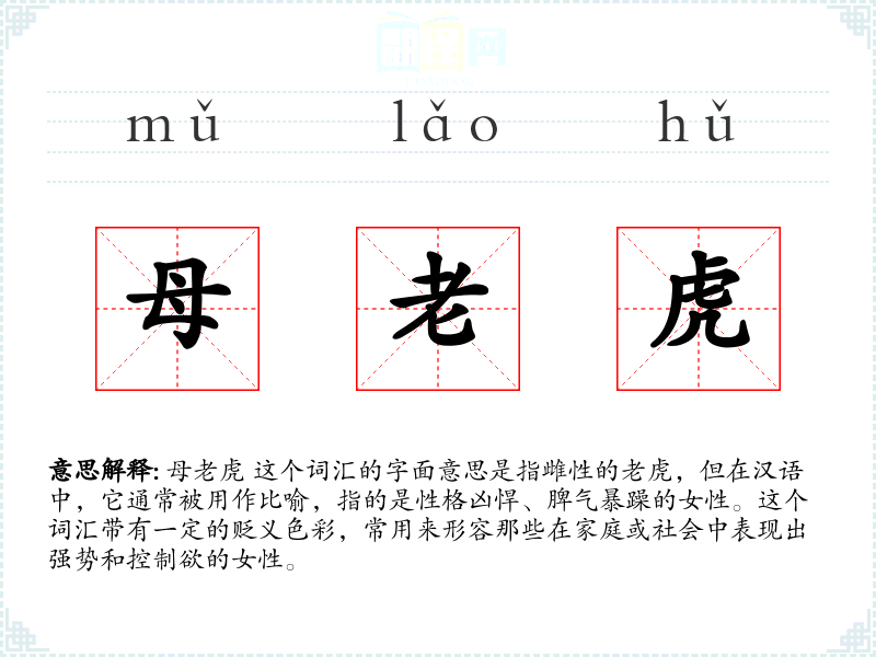 母** 这个词汇的字面意思是指雌性的**,但在汉语中,它通常被用作比喻,指的是性格凶悍、脾气暴躁的女性。这个词汇带有一定的贬义色彩,常用来形容那些在家庭或社会中表现出强势和控制欲的女性。