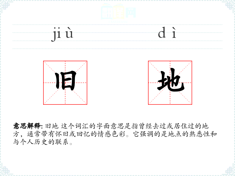 旧地 这个词汇的字面意思是指曾经去过或居住过的地方,通常带有怀旧或回忆的情感色彩。它强调的是地点的熟悉性和与个人历史的联系。