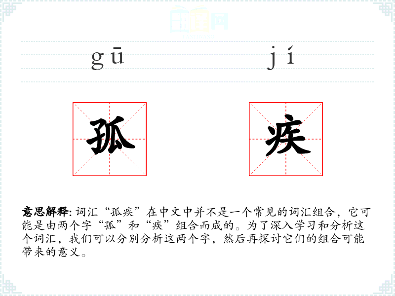 词汇“孤疾”在中文中并不是一个常见的词汇组合,它可能是由两个字“孤”和“疾”组合而成的。为了深入学*和分析这个词汇,我们可以分别分析这两个字,然后再探讨它们的组合可能带来的意义。