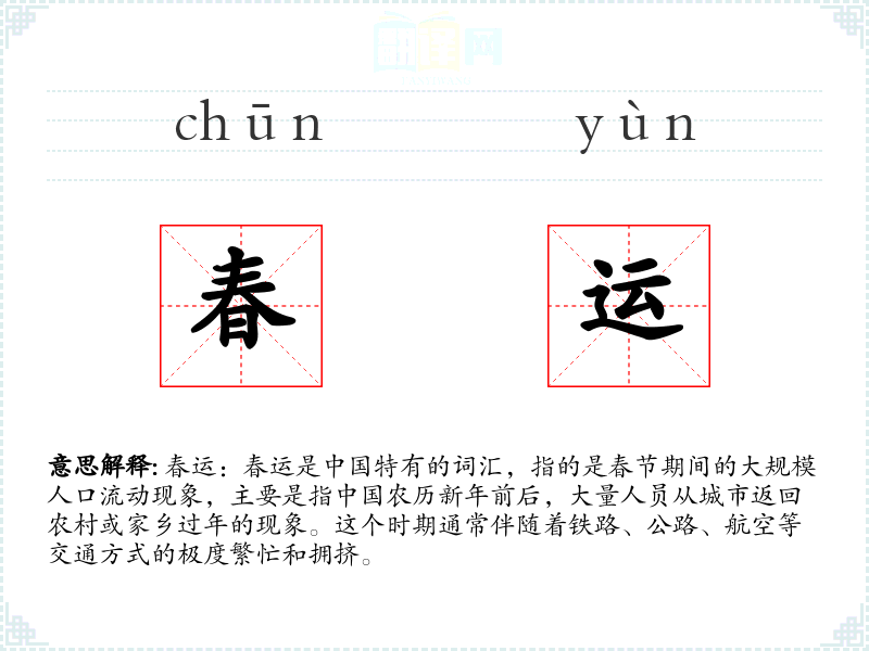 春运:春运是**特有的词汇,指的是春节期间的*人口流动现象,主要是指农历新年前后,大量人员从城市返回农村或家乡过年的现象。这个时期通常伴随着铁路、公路、航空等交通方式的极度繁忙和拥挤。