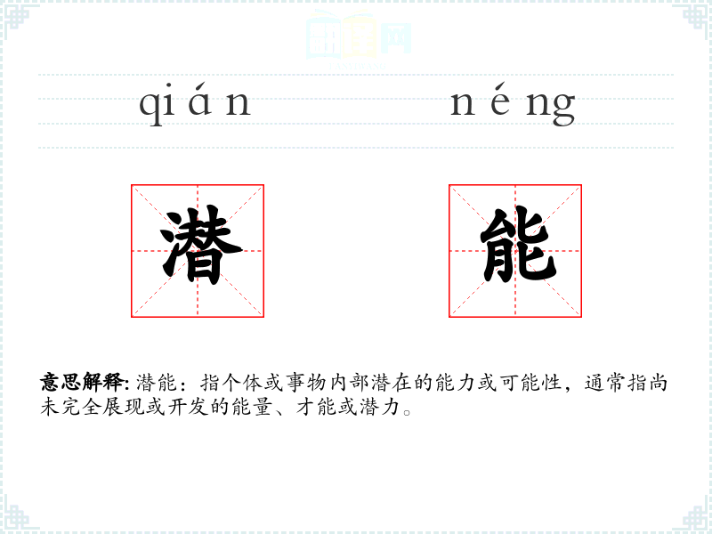 潜能:指个体或事物内部潜在的能力或可能性,通常指尚未完全展现或开发的能量、才能或潜力。