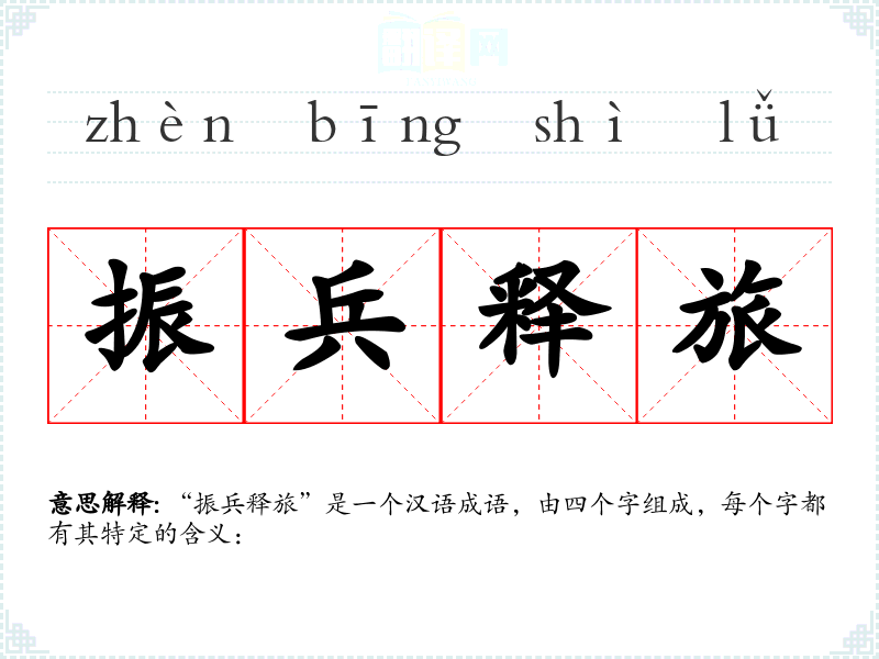 “振兵释旅”是一个汉语成语,由四个字组成,每个字都有其特定的含义: