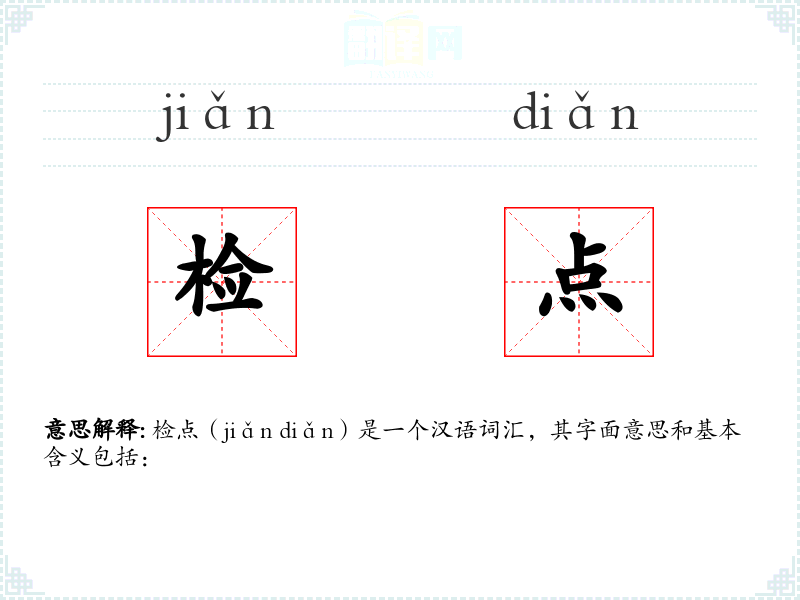检点(jiǎn diǎn)是一个汉语词汇,其字面意思和基本含义包括: