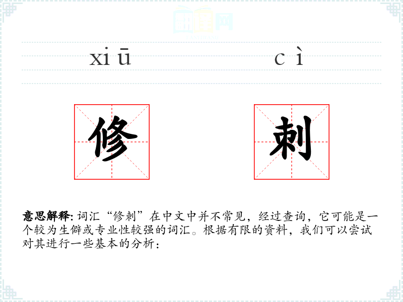 词汇“修刺”在中文中并不常见,经过查询,它可能是一个较为生僻或专业性较强的词汇。根据有限的资料,我们可以尝试对其进行一些基本的分析: