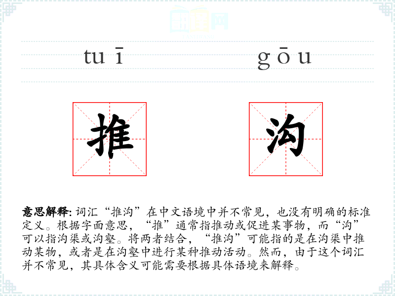 由于“推沟”不是一个标准词汇,其词源和演变历史不详。可能是某些地区或社群中的特定用语,随着时间的推移,其使用范围可能有所变化。