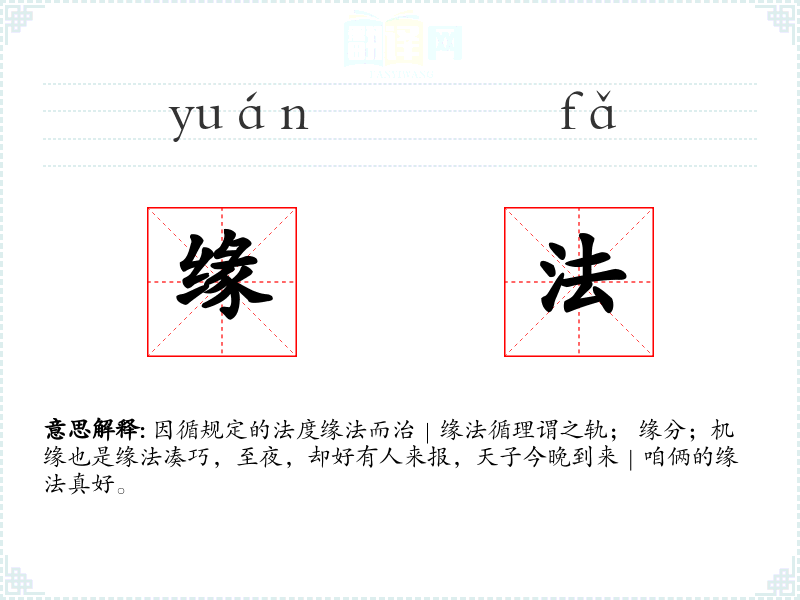 因循规定的法度缘法而治|缘法循理谓之轨; 缘分;机缘也是缘法凑巧,至夜,却好有人来报,天子今晚到来|咱俩的缘法真好。